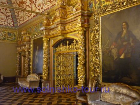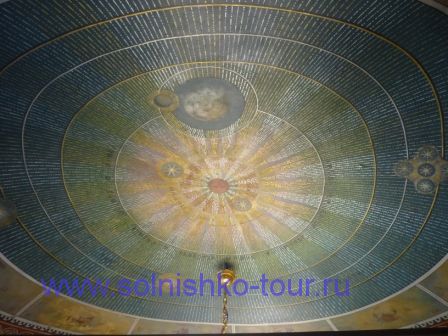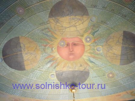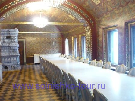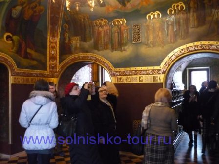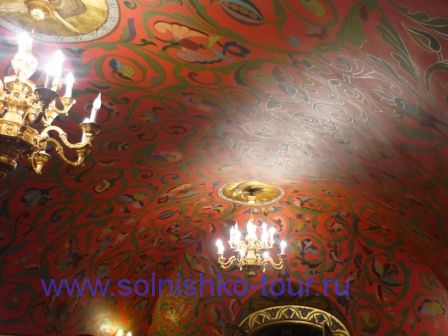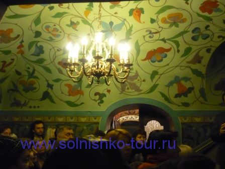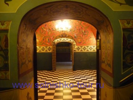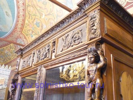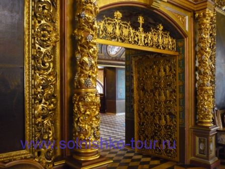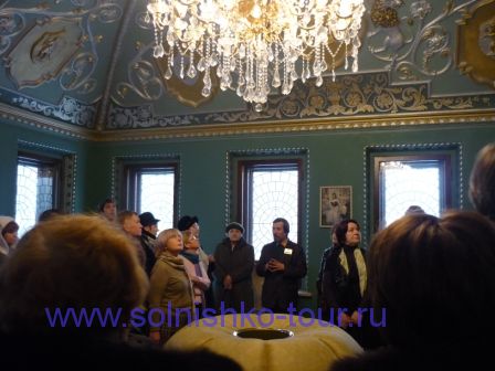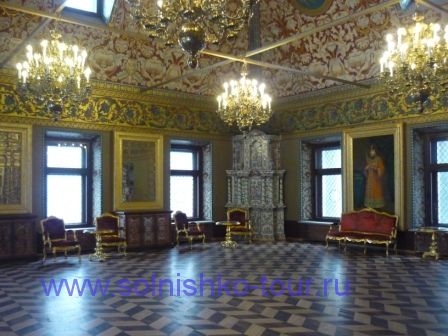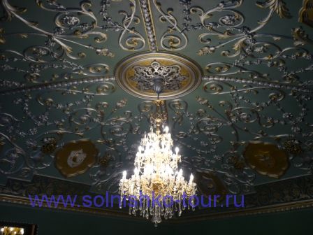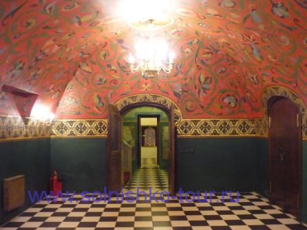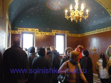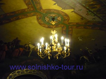 Красивая реставрированная крыша шашечками На первом этаже все потолки сводчатые и красиво вручную расписанные в некоторых залах на стенах написаны настоящие картины на втором этаже большой зал для приемов с золотой резьбой и росписью наша группа внимательно слушает рассказ экскурсовода каждая из комнат непохожа на другую, это голубая гостинная на стенах висят портреты владельцев замка на третьем этаже расположены молельные комнаты своды расписаны ликами святых